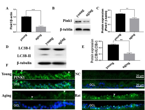 Decreased mitophagy and autophagy in aging zebrafish retinas. (A) Pink1 gene expression in young and aging zebrafish retinas as measured by quantitative real-time PCR (mean ± SEM, ***P<0.001, n=3). (B) Representative western blot showing the protein expression level of Pink1 in young and aging zebrafish retinas. (C) Graph of the densitometric mean and SEM normalized to the corresponding level of the loading control protein beta-tubulin (**P<0.01, n=3). (D) Representative western blot showing the protein expression levels of LC3B-II and LC3B-I in young and aging zebrafish retina. (E) Graph of the ratio of LC3B-II to LC3B-I protein levels as determined by densitometry (**P<0.01, n=3). (F) Immunofluorescence analysis of Pink1 in the RGC layer of young and aging zebrafish retinas. Retina cross sections prepared from zebrafish eyes were immunostained with Pink1 antibody. All photographs were taken at 40x magnification except the rat sections that were at 20x. Young, 4-6 months old; aging, 19-23 months old; NC, negative control (without primary antibody); Rat, positive control; GCL, ganglion cell layer.