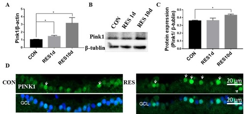Resveratrol treatment increased mitophagy in young zebrafish retina. (A) Pink1 gene expression in adult zebrafish retina after treatment with resveratrol for 1 and 10 days as measured by quantitative real-time PCR (mean ± SEM, *P<0.05 compared to control (CON), n=3). (B) Representative western blot showing the protein expression of Pink1 in adult zebrafish retina after treatment with resveratrol for 1 and 10 days. (C) Graph of the densitometric mean and SEM normalized to the corresponding level of the loading control protein beta-tubulin from western blots as in B (*P<0.05 compared to control (CON), n=3). (D) Immunofluorescence localization and relative expression of Pink1 in the RGC layer of adult zebrafish retinas after treatment with resveratrol for 10 days. Retina cross sections prepared from zebrafish eyes were immunostained with Pink1 antibody. All photographs were taken at 40x magnification. CON, control; RES1d, resveratrol treated for 1 days; RES/RES10d, resveratrol treated for 10 days; GCL, ganglion cell layer.