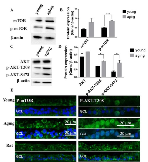Activation of the Akt/mTOR pathway in aging zebrafish retinas. (A) Representative western blot showing the protein level of mTOR and p-mTOR in young and aging zebrafish retinas. (B) Densitometric mean and SEM normalized to the corresponding level of the loading control protein beta-actin (***P<0.001, n=3. (C) Representative western blot showing the protein expression level of Akt and p-Akt-T308 and p-Akt-S473 in young and aging zebrafish retinas. (D) Densitometric mean and SEM normalized to the corresponding level of the loading control protein beta-actin (*P<0.05, n=3. (E) Photographs of fluorescent immunostained retina cross-sections showing the localization and relative levels of p-mTOR and p-Akt-T308 in the RGC layers of young and aging zebrafish retinas. All photographs were taken at 40x magnification except rat sections were at 20x magnification and p-Akt-T308 at 60x magnification. Young, 4-6 months old zebrafish; Aging, 19-23-month-old zebrafish; Rat, positive control; GCL, ganglion cell layer.