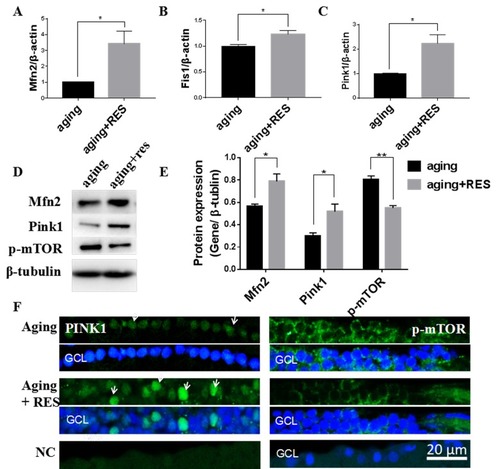 Resveratrol treatment activated Mfn2, Fis1, Pink1, and suppressed p-mTOR in aging zebrafish retina. (A-C) Mfn2, Fis1, Pink1 expression in aging and resveratrol-treated aging zebrafish retina. Graphs represent (A)Mfn2 (B) Fis1(C) Pink1 gene expression by quantitative real-time PCR (mean ± SEM, *P<0.05, n=3). (D)Representative western blot showing the protein expression levels of Mfn2,Pink1,p-mTOR in aging and resveratrol-treated aging zebrafish retina. (E)The graph showing the densitometric mean and SEM normalized to the corresponding level of the loading control protein beta-tubulin (*P<0.05, **P<0.01, n=3). (F) Immunolocalization and relative quantitative expression of Pink1 and p-mTOR on RGC in aging and resveratrol-treated aging zebrafish retina cross-sections. Retina cross sections prepared from zebrafish eyes were immunostained with Mfn2 or p-mTOR antibody. Results present aging, resveratrol-treated aging, and negative control (without primary antibody). All photographs were taken at 40 times. aging, 19-23 months zebrafish; aging + RES, resveratrol-treated aging zebrafish for 10 days; NC, negative control; GCL, ganglion cell layer.