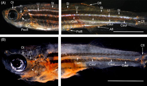 Functional lymph vascular system in the flt4 C526Δ (officially named flt4 um159) adult zebrafish mutant visualized through intraperitoneal dye injection (Abbreviations; see Table 1). A, Although subcutaneous color pigments interfered with visualization, all the functional lymph ducts were labeled with cinnabar in the wild‐type zebrafish (adult). B, Cinnabar dye labeled the branchial, facial and orbital lymph ducts in the cranial region but only weakly labeled the cardinal (thoracic duct) and caudal lymph vessels in the trunk and tail of the flt4 um159 mutant (3 months postfertilization). To verify each parietal lymphatic duct, the brain, gills, and visceral organs were removed from the wild‐type fish (A), but the gills and visceral organs remained in the mutant fish (B). Both fixed specimens were cleared with pure glycerol. White bars; 5 mm |