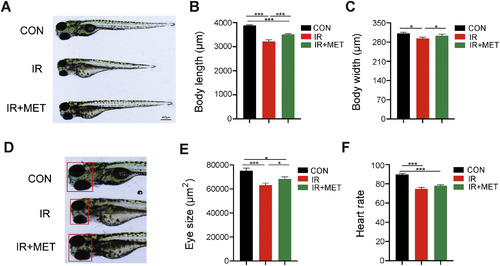 MET improves the morphological indexes of the larvae following radiation challenge. (A-B) Representative stereoscopy of the effects of MET (2 mg/mL) on the body length in zebrafish larvae and corresponding statistical results. (C) Body width of zebrafish larvae at 120 hpf. (D-E) Representative stereoscopy of the effects of MET (2 mg/mL) on the eye size in zebrafish larvae and corresponding statistical results. Each experiment was repeated at least three times, n = 8 larvae per treatment. (F) Effects of MET (2 mg/mL) on the heart rate of zebrafish embryos after radiation exposure (5.2 Gy). The experiment was repeated at least three times, n = 10 embryos per treatment. All data were presented as mean ± SEM. Student's t-test, *P < 0.05, ***P < 0.001. PHENOTYPE:
