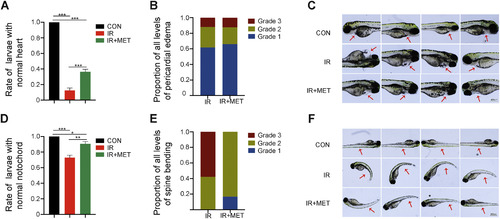 MET mitigates radiation-induced deformation of zebrafish larvae. (A) Effects of MET (2 mg/mL) on the rate of larvae with normal heart after radiation exposure (5.2 Gy). (B) The proportion of each level of spine bending in the total curvature between IR and MET group. (C) Representative images of the effects of MET on the pericardial edema in zebrafish larvae. (D) Effects of MET (2 mg/mL) on the rate of larvae with normal notochord after radiation exposure (5.2 Gy). (E) The proportion of each level of pericardial edema in the total pericardial edema between IR and MET group. (F) Representative images of the effects of MET on the spine bending in zebrafish larvae. Each experiment was repeated at least three times and each treatment group contains 108 zebrafish larvae divided into nine parallel groups. The data were presented as mean ± SEM. Student's t-test, *P < 0.05, **P < 0.01, ***P < 0.001. PHENOTYPE: