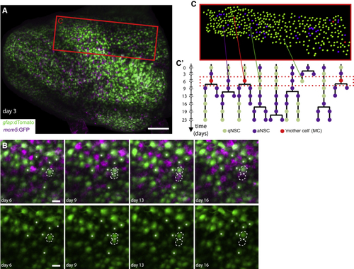 Intravital imaging resolves adult NSC lineage trees in time and space (A) Whole pallial hemisphere imaged intravitally in a 3mpf (B) Close-ups from the same video showing an asymmetric NSC division (dotted circles) between days 3 and 9: 1 daughter differentiates over the next 7 days (bottom dotted circle, loss of the (C and C’) Segmentation and NSC tracking over 23 days in Dm in Mimi. (C) Segmentation of ~390 cells per time point (area boxed in A, at day 6). (C’) Example of dividing tracks, with cell states (color-coded) and the spatial position of each tree (see also |