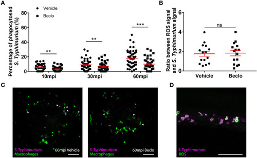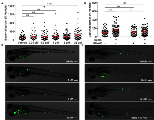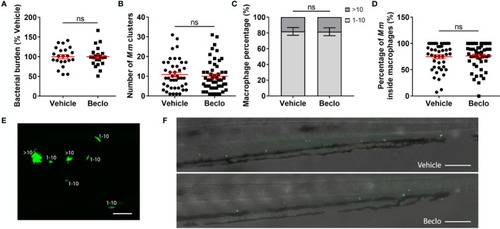Effect of beclomethasone on the bacterial growth of the Mm Δerp mutant. The Mm Δerp mutant strain was injected intravenously at 28 hpf, and at 44 hpi, the bacterial burden (A), the number of Mm clusters (B), the percentage of macrophages that contained 1-10 or more than 10 bacteria (of all macrophages containing bacteria) (C), and the percentage of Mm inside macrophages (D) were determined. No significant difference was observed between the vehicle- and beclomethasone-treated groups for any of these parameters. Statistical analysis was performed using two-tailed t-tests. Values shown are the means ± s.e.m. of three independent experiments, with each data point representing a single embryo. Statistical significance is indicated by: ns, non-significant. (E) Representative confocal microscopy image of Mm Δerp bacterial clusters (bacteria in green), indicated are clusters containing 1-10 bacteria and clusters containing more than 10 bacteria. Scale bar = 20 μm. (F) Representative images of the tail regions of a vehicle- and a beclomethasone-treated embryo infected with Mm Δerp bacteria. Scale bar = 100 μm. |