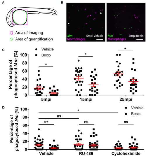 Effect of beclomethasone on phagocytic activity of macrophages and its dependency on Gr and de novo protein synthesis. (A) Schematic drawing of a zebrafish embryos at 28 hpf indicating the areas of imaging (purple dashed box, used for representative images) and quantification (green dashed circle) of Mm phagocytosis. (B) Representative confocal microscopy images of embryos of the Tg(mpeg1:mCherry-F) line injected with Mm at 28 hpf. Images were taken of infected embryos that were vehicle- or beclomethasone-treated at 5 minutes post infection (mpi). Macrophages are shown in magenta, bacteria in green. Scale bar = 100 μm. Arrowheads indicate bacterial clusters phagocytosed by macrophages. (C) Percentages of phagocytosed Mm clusters (of total number of Mm clusters) at 5, 15 and 25 mpi. Statistical analysis, performed by fitting data to a beta inflated regression with Tukey’s post hoc test, showed that beclomethasone decreased this percentage at all three time points. (D) Effects of RU-486 and cycloheximide on the beclomethasone-inhibited phagocytic activity. Embryos were treated with vehicle or beclomethasone and received either a vehicle, RU-486 or cycloheximide co-treatment two hours before injection of Mm at 28 hpf, and phagocytic activity was determined at 5 mpi. The significant inhibitory effect of beclomethasone on phagocytosis was not observed in the presence of RU-486. Cycloheximide, just like beclomethasone, significantly inhibited the phagocytic activity, and the combined cycloheximide/beclomethasone treatment showed the same level of inhibition. Statistical analysis was performed by fitting data to a beta inflated regression with Tukey’s post hoc test. In panels (C, D), each data point represents a single embryo and the means ± s.e.m. of data accumulated from three independent experiments are shown in red. Statistical significance is indicated by: ns, non-significant; *P<0.05; **P<0.01. |