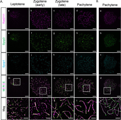 (A) Rad21l1 loading during prophase I of meiosis in spermatocyte nuclear surface spreads. Rad21l1 (magenta) loads onto chromosome axes simultaneously with Sycp3 (green) and is also dispersed as foci throughout the spread in leptotene. In early zygotene, Sycp1 (cyan) lines start near the telomeres and synapsis extends inward through late zygotene and are present end-to-end along axes. Note: there is some asynapsis in the pachytene nucleus which may indicate that the cell was either in very early or very late pachytene. The merged images are Rad21l1 and Sycp3 channels only. Mag images are magnifications from the Merge panels; the regions magnified are indicated by white boxes. Panel series a-p scale bar = 5 μm. Mag panel series q-t scale bar = 2 μm. (B) Rad21l1 loading during prophase I of meiosis in oocyte nuclear surface spreads. Panels a-e are arranged similarly to the corresponding panels of part (A). |