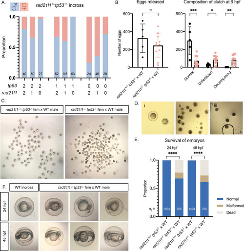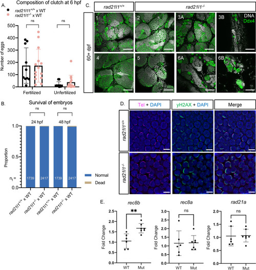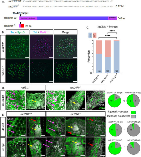 (A) TALEN generated 17-bp deletion leads to a frameshift mutation resulting in a truncated 27 amino acid (aa) Rad21l1 protein with the conserved Rec8/Rad21-like family domains (1–100 aa and 495–543 aa) disrupted or deleted. Rec8/Rad21-like domains (purple boxes); altered amino acid sequence (red box). The ATG translational start site is located at the 4th-6th nucleotide from the end. (B) Spermatocyte nuclear spreads stained for telomeres (cyan), Sycp3 (green), and Rad21l1 (magenta). Rad21l1 forms lines of foci along the Sycp3 axis in |