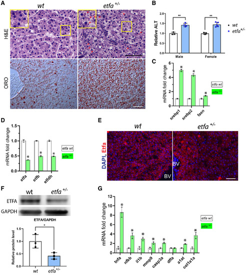 Etfa haploinsufficiency induces hepatic injury and steatosis in adult zebrafish. (A) Representative images show hepatocyte ballooning and accumulation of cytosolic components (note eosinophilic cytoplasmic droplets marked with arrow heads) in hepatocytes in etfa+/− livers (H&E staining). Magnified views (yellow rectangles) are shown. In the bottom panels, sections were stained with ORO (representative images are shown, n = 5/5); scale bar, 50 µm. (B) Relative serum ALT levels in etfa+/− siblings compared to the wild type (n = 3 to 5). (C) Livers were harvested, and pooled total RNA was subjected to qRT-PCR (see Materials and Methods) to determine relative mRNA expression genes associated with de novo lipogenesis (srebp1, srebp2, and fasn). (D) Relative mRNA expression of genes of etfa, etfb, and etfdh (*P < 0.05 vs. the wild type). (E) Immunofluorescence staining with anti-Etfa antibody (red) on wild-type and etfa+/− liver sections; scale bar, 50 µm. Nuclei were stained with DAPI. (F) Relative amount of Etfa protein in wild-type and etfa+/– liver lysates (n = 3). (G) Relative mRNA expression of genes associated with inflammation (tnfa, nfkb, il1b, and mmp9), cell death (casp3a and dffa), injury (a1at), and fibrosis (col1a1a). Pooled RNAs (from three livers per group) were used for qRT-PCR analysis. *P < 0.05, **P < 0.005 vs. the wild type. Data in bar graphs represent mean ± SD. Abbreviations: BV, blood vessel; DAPI, 4′,6-diamidino-2-phenylindole; GAPDH, glyceraldehyde 3-phosphate dehydrogenase. |