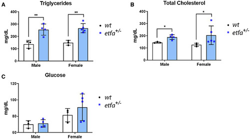 Etfa+/− zebrafish exhibit hyperlipidemia and hypercholesterolemia. (A) Blood was drawn (see Materials and Methods), and serum TGs, (B) TC, and (C) glucose were measured in male and female wild-type (n = 3, white bars) and etfa+/− siblings (n = 4, blue bars). *P < 0.05, **P < 0.005 versus the wild type. Data represent mean ± SD. |
