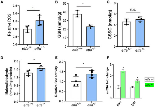 Etfa haploinsufficiency increases oxidative stress in the liver. (A) ROS (H2O2), (B) GSH, (C) GSSG, and (D) MDA were measured in wild-type and etfa+/− male siblings (see Materials and Methods). (E) Relative activity of Gsr in etfa+/− siblings versus the wild type (n = 4), and (F) mRNA expression of gss and gsr. Error bars show the mean ± SD; *P < 0.05. Abbreviation: n.s., not significant. |