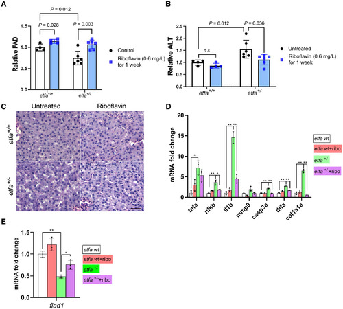 Riboflavin supplementation suppresses hepatic injury and genes associated with inflammation in etfa+/− livers. Adult zebrafish were exposed to riboflavin containing water (0.6 mg/L) for 1 week, with water replacement (with riboflavin) once per day. Whole livers were harvested, and relative amounts of (A) FAD levels and (B) serum ALT levels were measured in etfa+/− with (white bars) or without (blue bars) riboflavin treatment compared to the wild type (etfa+/+) (see Materials and Methods) (n = 4 to 6). (C) Representative images of H&E-stained liver sections in the wild type and etfa+/− mutants with or without riboflavin treatment (n > 6 per each); scale bar, 25 µm. (D) Total RNA was isolated from whole livers as above, and mRNA expression of genes associated with inflammation (tnfa, nfkb, il1b, and mmp9), cell death (casp3a and dffa), injury (a1at), and fibrosis (col1a1a) from pooled RNA were measured by qRT-PCR (see Materials and Methods). (E) Changes in relative mRNA expression levels of flad1 were also measured. An equal amount of total RNA from three livers were pooled and used for cDNA synthesis; the same amount of cDNA was used for qPCR analyses. Error bars show mean ± SD; *P < 0.05, **P < 0.005. Abbreviation: n.s., not significant. |