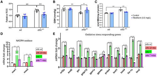 Riboflavin supplementation suppresses oxidative stress in etfa+/− mutant livers. Adult zebrafish were exposed to riboflavin, as in Fig. 4. (A) Relative ROS, (B) GSH levels, and (C) MDA levels in wild-type and etfa+/− livers from untreated or riboflavin-treated adult zebrafish were measured (see Materials and Methods) (n = 6 per group). Relative mRNA expression of (D) NADPH oxidases and (E) oxidative stress-responding genes was measured (see Materials and Methods; three livers were used to make normalized RNA; *P < 0.05, **P < 0.005). Abbreviations: gstp1/2, glutathione S transferase pi 1 and 2; ho-1a, heme oxygenase 1a; nrf2, nuclear factor erythroid 2-related factor 2; prdx4, peroxiredoxin 4. |