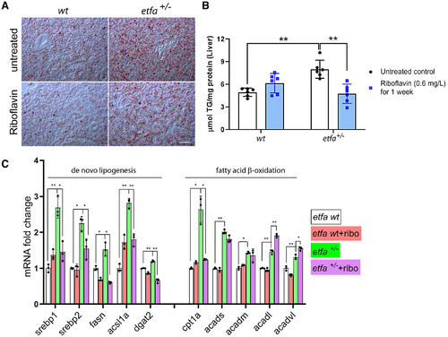 Riboflavin supplementation attenuates hepatic steatosis in etfa+/− livers by suppressing mRNA expression of genes in de novo lipogenesis and lipid uptake. Adult zebrafish were exposed to riboflavin, as in Fig. 4. (A) Representative images of ORO staining (n = 5 per group) in the wild type and etfa+/− mutants with or without riboflavin treatment for 1 week; Scale bar, 50 µm. (B) TG analysis in liver lysates from wild-type and etfa+/− livers with or without riboflavin treatment (n = 6 per group). (C) Relative mRNA expression of genes associated with de novo lipogenesis (srebp1, srebp2, fasn, acsl1a, and dgat2) and fatty acid β-oxidation (cpt1a, acads, acadm, acadl, and acadvl) was measured by qRT-PCR (see Materials and Methods; n = 3 per group, *P < 0.05, **P < 0.005). |