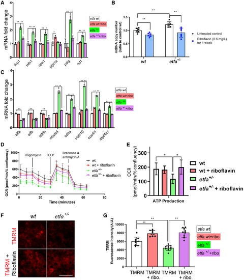 Effects of riboflavin on mitochondria in etfa+/− livers. Adult zebrafish were exposed to riboflavin, as in Fig. 4. Livers were harvested and (A) relative mRNA expression of genes associated with mitochondrial homeostasis and biogenesis, (B) relative copy number of mtDNA, and (C) relative mRNA expressions of genes in the ETF complex and mitochondrial complexes (I to V) in wild-type or etfa+/− livers with or without riboflavin treatment were measured by qRT-PCR (see Materials and Methods). (D) Hepatocytes were isolated, incubated for 3 days with or without riboflavin (0.6 mg/L), and OCR analysis was performed using Seahorse XF96 (see Materials and Methods). (E) ATP production-associated OCR in each group (n = 4; *P < 0.05, **P < 0.005). (F) Representative fluorescence images of TMRM-loaded wild-type and etfa+/− hepatocytes with or without riboflavin treatment; scale bar, 50 µm. (G) Mitochondrial membrane potential was compared by TMRM fluorescence intensity of hepatocytes in (F). Abbreviations: ATP, adenosine triphosphate; atp5fa1, adenosine triphosphate synthase F1 subunit alpha; A.U., arbitrary units; cox4i1, cytochrome c oxidase subunit 4 isoform 1; min, minutes; ndufs4, nicotinamide adenine dinucleotide:ubiquinone oxidoreductase subunit S4; pgc1a, peroxisome proliferator-activated receptor gamma coactivator 1-alpha; sdha, succinate dehydrogenase complex flavoprotein subunit A; uqcr10, ubiquinol-cytochrome c reductase 10. |