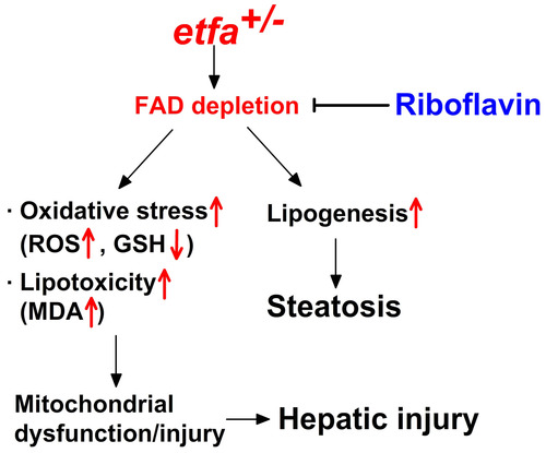 Diagram demonstrating etfa haploinsufficiency-induced hepatic steatosis and injury. Etfa haploinsufficiency causes FAD reduction in the liver, which in turn increases lipogenesis/steatosis in the liver. Additionally, increased oxidative stress and lipotoxicity by FAD depletion lead to mitochondrial dysfunction/injury that causes hepatocellular injury. |
