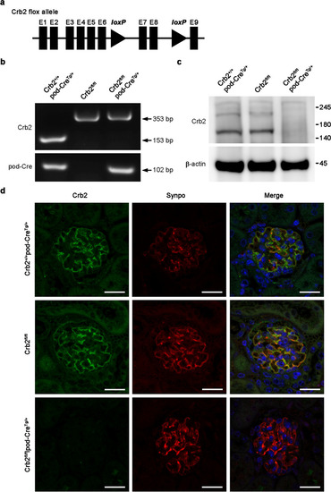 Generation of podocyte-specific Crb2 knockout mice. (a) Two loxP sites were inserted into introns 6 and 8 of the Crb2 gene to skip exons 7 and 8 in the Crb2 floxed allele. (b) While there was a 353-bp band with Crb2 primers in Crb2fl/fl mice and Crb2fl/flpod-CreTg/+ mice, there was a 153-bp product in Crb2+/+pod-CreTg/+ mice. There was a 102-bp band with pod-Cre primers in Crb2+/+pod-CreTg/+ mice and Crb2fl/flpod-CreTg/+ mice. (c) There were a strong band between 140–180 kDa and a weak band between 180–245 kDa markers with CRB2 antibody in the glomeruli from Crb2+/+pod-CreTg/+ mice or Crb2fl/fl mice, while these bands were invisible in those of Crb2fl/flpod-CreTg/+ mice at 2 months of age. The band of β-actin was similar among the three groups. (d) Synpo, a podocyte marker, was co-localized with Crb2 in Crb2+/+pod-CreTg/+ or Crb2fl/fl mice. No co-localization of Crb2 and Synpo was observed in Crb2fl/flpod-CreTg/+ mice. Scale bars 20 μm. |