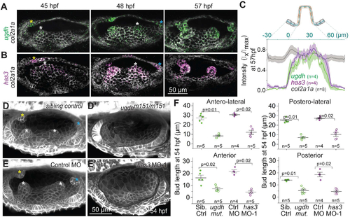 (A and B) Maximum intensity projections of OVs at select time points stained with multiplex in situ probes against ugdh (green) and col2a1a (white) (A), and has3 (purple) and col2a1a (white) (B). The z-volume is different across time points to capture all the buds, and hence the contrast of each time point is individually set for better visualization. Scale bar, 50 μm. (C) Mean intensities±standard error (s.e.) of various genes across the illustrated region of interest (ROI) in the anterior bud at 57 hpf. (D and E) Representative examples of 3D-rendered OVs at 54 hpf from sibling control and ugdhm151/m151 mutant embryos labelled with membrane-NeonGreen mRNA (D), and Tg(βActin:membrane-Citrine) embryos injected with control morpholino (MO) and has3-specific MO-1 (E). Buds in controls are marked by asterisk (white, yellow and cyan for lateral, anterior and posterior buds respectively). Genetically perturbed embryos have no buds. Anterior to the left and DL into the plane of view. Scale bar, 50 μm. (F) Individual data points and mean±standard deviation (s.d.) of bud lengths in controls and genetic perturbations at 54 hpf. In the absence of buds, bud lengths correspond to cell lengths. ‘n’ denotes the number of buds measured per condition. p values as labelled (Mann Whitney- U test). |