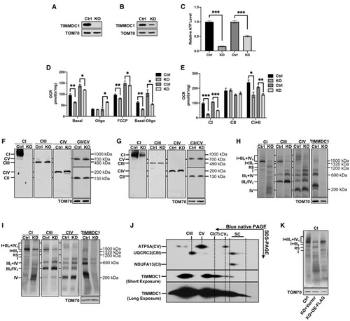 Figure 1. Loss of TIMMDC1 leads to the accumulation of respirasome subcomplex (A and B) Western blot (WB) analysis of the steady-state levels of TIMMDC1 in HEK293T cells with KO of TIMMDC1 (A), KD of TIMMDC1 (B), and paired control cells (Ctrl). TOM70 was used as an internal control. (C) Cellular ATP content in HEK293T cells with KO and KD of TIMMDC1 and paired control cells (Ctrl). (n = 3) (D) Cell respiration was determined by measuring the oxygen consumption rate (OCR) in HEK293T cells with KO and KD of TIMMDC1 and in paired control cells (Ctrl). Endogenous respiration is presented as follows: basal, basal-cell respiration; oligo, the non-phosphorylating proton leaked respiration measured in the presence of oligomycin (2 μg/mL); FCCP, un-coupling respiration measured in the presence of carbonyl cyanide 4-(trifluoromethoxy)phenylhydrazone (2.5 μM); basal-oligo, absolute respiration of ADP to ATP phosphorylation. (n = 3) (E) Respiratory complex-dependent OCR in HEK293T cells with KO and KD of TIMMDC1 and in paired control cells (Ctrl). CI, respiration in the presence of malate and glutamate. CII, respiration in the presence of succinate. CI+CII, respiration in the presence of malate, glutamate, and succinate. (n = 3) (F and G) Steady-state levels of OXPHOS complexes were analyzed in HEK293T cells with KO (F) and KD (G) of TIMMDC1 and in paired control cells (Ctrl). N-dodecyl β-d-maltoside (DDM) solubilized protein was separated by 3.5%–16% blue-native PAGE. OXPHOS complexes were detected by immunoblotting with antibodies against proteins as indicated (CI, NDUFA13; CII, SDHA; CIII, UQCRC2; CIV, MT-CO1; CV, ATP5A). Complexes I–V are abbreviated as CI–V. TOM70 was used as an internal control. (H and I) Respiratory supercomplexes were analyzed in HEK293T cells with KO (H) and KD (I) of TIMMDC1 and in paired control cells (Ctrl). Digitonin-solubilized protein was separated by 3%–11% blue-native PAGE. Respiratory supercomplexes were immunoblotted with antibodies as indicated (CI, NDUFB6; CIII, UQCRC2; CIV, MT-CO1). TOM70 was used as an internal control. (J) 2D blue-native PAGE/tricine SDS-PAGE and immunoblotting analysis of HEK293T cells. Digitonin-solubilized protein was separated by 1D 3%–11% blue-native PAGE, followed by 2D tricine SDS-PAGE. OXPHOS complexes were immunoblotted with anti-CI (NDUFB6), -CIII (UQCRC2), -CV (ATP5A), and -TIMMDC1 antibodies. (K) Blue-native PAGE and immunoblotting analysis of HEK293T cells (Ctrl), TIMMDC1−/− cells with empty vector (KO+vector), and TIMMDC1−/− cells with re-expression of FLAG-tagged TIMMDC1 (KO+OE-FLAG; OE [overexpression]). Digitonin-solubilized protein was separated by 3%–11% blue-native PAGE and then immunoblotted with the anti-NDUFB6 (CI) antibody. TOM70 was used as an internal control. Quantitative data were generated from three independent experiments. Data are presented as the means ± SEM. ∗p < 0.05, ∗∗p < 0.01, ∗∗∗p < 0.001. |