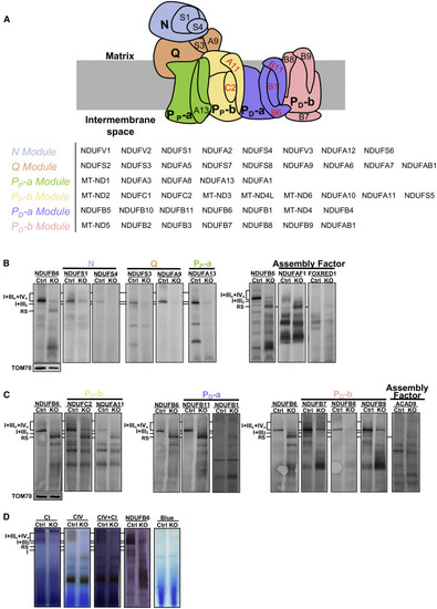 Figure 2. Respirasome subcomplex contains an immature complex I (A) Cartoon of complex I with different modules. The model was prepared based on modifications to the existing model (Guerrero-Castillo et al., 2017). Subunits named in the cartoon are shown in (B) and (C). Subunits of each module are shown in the figure table (bottom). (B and C) Blue-native PAGE and immunoblotting analysis of N, Q, PP-a, PP-b, PD-a, and PD-b modules and assembly factors in the respirasome subcomplex (RS). Representative subunits corresponding to N, Q, PP-a, PP-b, PD-a, and PD-b modules and assembly factors were immunoblotted in digitonin-solubilized proteins separated by 3%–11% blue-native PAGE. N, Q, PP-a, PP-b, PD-a, and PD-b modules and assembly factors were immunoblotted with anti-NDUFS1 and NDUFS4 (B), anti-NDUFS3 and NDUFA9 (B), anti-NDUFA13 (B), anti-NDUFC2 and NDUFA11 (C), anti-NDUFB1, -NDUFB6, and -NDUFB11 (C), and anti-NDUFAF1, -FOXRED1 (B), and anti-ACAD9 (C), respectively. TOM70 was used as internal control. Ctrl, HEK293T cells; KO, TIMMDC1−/− cells. (D) In-gel activity assay (IGA) for CI and CIV was performed in control (Ctrl) and TIMMDC1−/− (KO) cells. Digitonin-solubilized protein was separated by 3%–13% blue-native PAGE and incubated with substrates for the detection of CI, CIV, and CI+CIV. CI was immunoblotted with anti-NDUFB6 antibody. Coomassie-blue-stained blue-native gel (blue) was used as a loading control. |