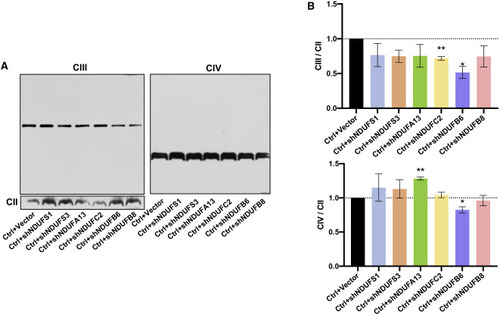 Figure 5. Respirasome subcomplex preserves the steady-state levels of holo-CIII and CIV Blue-native PAGE and immunoblotting analysis of the CIII and CIV (A) in HEK293T cells with sequence-specific KD of six subunits from each module and control HEK293T cells (Ctrl). DDM-solubilized protein was separated by 3.5%–16% blue-native PAGE. CII (SDHA) was used as an internal control. Quantitative analysis of CIII and CIV (B) was performed with three independent experiments and presented as the means ± SEM. ∗p < 0.05, ∗∗p < 0.01. |