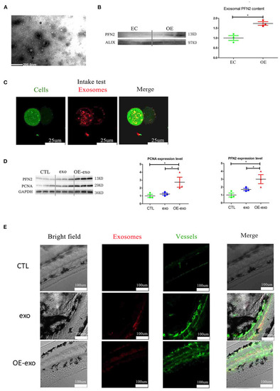 Exosomal PFN2 enhances the proliferation ability of ECs and OE-exo treated zebrafish showed significantly increased vessel number than exo and control. |