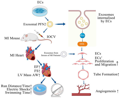 GRAPHICAL ABSTRACT. PFN2-overexpressing ECs (OE-exo) treated MI mice showed improvement in infarction volume, cardiac function and motor ability, and PFN2/ OE-exo significantly enhanced EC proliferation, migration, tube formation ability and angiogenesis. |