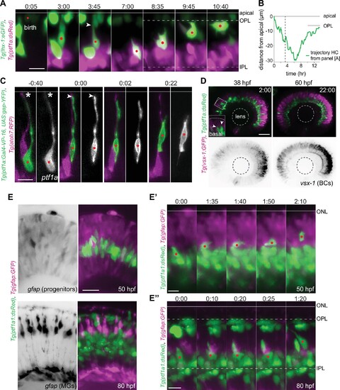 (A) Montage of bidirectional migration of a horizontal cell (HC) from birth to final positioning. Tg(lhx-1:eGFP) labels HCs (green), Tg(Ptf1a:dsRed) marks amacrine cells (ACs) and HCs (magenta). Red dot: tracked HC; arrowhead: HC detachment from the apical surface (line). Scale bar: 10 µm. Frames from Video 1. (B) Trajectory of a migrating HC (depicted in A) from birth to terminal position relative to the apical surface (0 µm). See Figure 1—source data 1. (C) Retraction of HC apical attachment. Tg(ptf1a:Gal4-VP-16, UAS:gap-YFP) labels membrane of HCs (green), and Tg(atoh7:RFP) labels membranes of photoreceptors (PRs) and retinal ganglion cells (RGCs) (magenta). The tracked HC was monitored until it reached the HC layer. Red dot: tracked HC; asterisk: apical attachment; arrowhead: tip of the retracted attachment; line: apical surface. Scale bar: 10 µm. (D) Stills from time-lapse images of a retina before (38 hours post fertilization [hpf]) and after (60 hpf) BC lamination. Tg(ptf1a:dsRed) labels HCs and ACs (green), Tg(vsx1:GFP) marks BCs (magenta). Scale bar: 50 μm. Higher magnification inset of the outlined region shows two HCs moving apically (arrowheads). (E–E”) HCs do not migrate along radially oriented progenitors or MGs. Tg(Ptf1a:dsRed) marks ACs and HCs (green), Tg(gfap:GFP) labels MGs (magenta). (E) Top: Prior to MG generation (50 hpf). GFAP+ cells are neurogenic progenitors. Bottom: Mature bipolar MG morphology (80 hpf). Scale bar: 20 µm. (E’) Montage of an HC migrating perpendicular to GFAP+ progenitors in 50 hpf. GFAP+ cells are neurogenic progenitors. (E’’) Stills of an HC migrating perpendicular to mature MGs in 80 hpf. Scale bar: 10 µm. Line: apical surface; red dot: migrating HC; dotted line: OPL (top), IPL (bottom). Time in h:min (A, C, D, E’–E’’). |