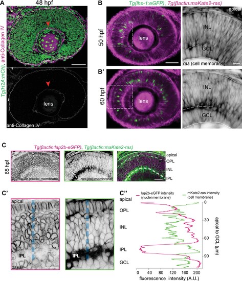 (A) Immunofluorescence image of a 48 hours post fertilization (hpf) retina.Tg(h2a:mCh) labels all retinal nuclei (green), and collagen antibody marks collagen type IV (magenta). Bottom panel: Higher magnification inset of the retina show anti-collagen IV (gray). Red arrowhead: basement membrane. Scale bar: 50 μm. (B–B’) Stills from time-lapse of a retina at 50 hpf (B) and 60 hpf (B’). Tg(lhx-1:eGFP) labels HCs (green), Tg(βactin:maKate2-ras) marks cell membranes of all retinal cells (magenta). Scale bar: 50 µm. Right panels: Higher magnification insets of the outlined regions show cell membranes (gray). Dashed line: forming inner plexiform layer (IPL). Scale bar: 10 μm. (C) Confocal sections of Tg(βactin:lap2b-eGFP) labeling nuclear envelopes of all retinal cells (magenta), and Tg(βactin:maKate2-ras) labeling membranes of all retinal cells (green) at 65 hpf. Scale bar: 20 µm. (C’) Higher magnification insets of the outlined region showing nuclear envelopes (left panel) and cell membranes (right panel). Blue dashed line: region for intensity profile measurement in C”. Scale bar: 10 μm. (C’’) Line scan average fluorescent intensity profiles of βactin:lap2b-eGFP (magenta) and βactin:maKate2-ras (green) along the blue dashed line. See Figure 2—source data 1.