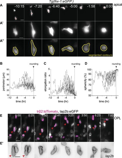 (A) Cytoplasmic deformations of a horizontal cell (HC) migrating from the basal inner nuclear layer (INL) to the HC layer. Cells from Tg(lhx-1:eGFP) transgene embryo were transplanted into wild-type (WT) embryos. White line: apical surface; red dot: tracked HC. Scale bar: 10 μm. Frames from Video 4. (A’) Close-up of HC in (A). Scale bar: 5 μm. (A’’) Representative sequences of the automated segmented contours of the cell body (yellow line) generated by Icy. (B–D) Cell morphodynamic changes in 12 HCs from seven embryos; (B) perimeter (μm), (C) elongation ratio, (D) sphericity (%). See Figure 3—source data 2. (E-E’) HCs nuclei undergo deformations and exhibit different shapes as they move to their final position. Nuclear envelopes are labeled by lap2b:eGFP (gray), and HCs/PRs are labeled by trβ2:tdTomato (magenta) DNA constructs. Dashed line: outer plexiform layer (OPL); red arrowhead: tracked HC; scale bar: 10 μm. (E’) Close-up of HC in (E) showing nuclear envelopes (gray). Scale bar: 5 μm. Time in h:min (A, E). |