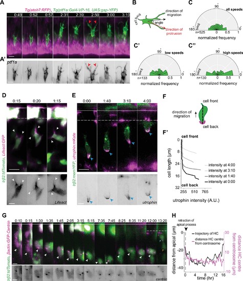 (A) Time-lapse sequence of highly dynamic membrane protrusions pointing in different directions (red arrowheads) in a migrating horizontal cell (HC). Tg(ptf1a:Gal4-VP-16,UAS:gap-YFP) labels membrane of HCs (green), Tg(atoh7:RFP) marks retinal ganglion cells (RGCs) and photoreceptors (PRs). Time interval = 1 min. Scale bar: 50 μm. (A’) Higher magnification insets of HC cell membrane from (A). Scale bar: 5 μm. (B) Scheme of protrusion angles measurements. (C–C’’) The frequency distribution of the angle between the direction of instantaneous movement of HC and its protrusions; (C) throughout the tracked basal-to-apical journey (t=4 hr), (C’) at low speeds: speeds below 25 percentile of this HC’s speed (<0.38 μm/min), (C’’) at high speeds: above 75 percentile of this HC’s speed (>0.93 μm/min). Minimum and maximum speeds observed for this cell are 0.06 and 4.44 µm/min, respectively. A protrusion pointing exactly toward the direction of cell movement exhibits an angle of 0°, and a protrusion pointing exactly opposite exhibits an angle of 180°. The radius indicates the normalized frequency for each angle bin, that is, the number of frames observed with the angle belonging to the particular angle bin for the given velocity condition normalized by the total number of frames observed in the given velocity condition. All measurements are from the migrating HC in (A–A’). See Figure 4—source data 1. (D–F’) F-actin distribution in migrating HCs: (D) trβ2:tdTomato and Lifeact-GFP DNA constructs mark HCs (green) and all filamentous F-actin (magenta), respectively. Lifeact-GFP is detected in the leading protrusions (white arrowheads) and the cell cortex. Scale bar: 20 μm. Bottom: close-up of Lifeact-GFP (gray) from (D). Scale bar: 5 μm. (E) trβ2:memYFP is expressed in HCs (green) and utrophin-mKate marks the stable filamentous F-actin (magenta). Utrophin is enriched at the cell back (blue arrowheads). Scale bar: 20 μm. Bottom: high magnification of utrophin:mKate (gray) in migrating HC from (E). Scale bar: 5 μm. (F) Scheme of line scan measurements of utrophin:mKate fluorescence intensity. (F’) Average utrophin:mKate fluorescent intensity profile of images at (E). Cell front and back are determined by the direction of HC movement. See Figure 4—source data 2. (G–H) Time series showing the dynamics of centrosome position in HCs from birth to final positioning. (G) β-actin:GFP-Centrin and trβ2:tdTomato DNA plasmids label centrosomes (magenta) and HCs (green), respectively. White arrowhead: HC. Cyan and orange arrows: sister HCs after mitosis. Bottom panel shows close-up of β-actin:GFP-Centrin (gray) in the tracked HC. White line: apical surface; dashed white line: HC layer. Scale bar: 20 μm. (H) Graph showing migration trajectory of the represented HC (black line) and the distance between its centrosome and center (magenta line) throughout migration. Arrowhead: time of detachment of the apical process. See Figure 3—source data 2, Figure 3—source data 3. Time in h:min (A–G). See also Figure 4—figure supplements 1 and 2.