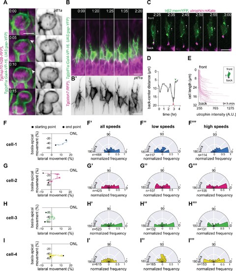 Analysis of HC protrusions. (A) Time-series of a horizontal cell (HC) during mitosis shows that HCs display membrane blebs (white arrowhead) during rounding.Tg(ptf1a:Gal4-VP-16,UAS:gap-YFP) labels HC membrane (green) and Tg(hsp70:H2B-RFP) is expressed in nuclei (magenta). Right panel: HC membrane (gray). Scale bar: 5 μm. (B) Time-lapse sequence of dynamic protrusions of a migrating HC. Protrusions display different morphologies and point in different directions. Tg(ptf1a:Gal4-VP-16,UAS:gap-YFP) labels HC membrane (green). Scale bar: 20 μm. Bottom: close-up of HC membrane (gray). Scale bar: 10 μm. White line: apical surface. (B’) Close-up of HC protrusions from (B). Scale bar: 5 μm. Frames from Video 7. (C) Time series of a migrating HC (green) (labeled by trβ2:memYFP DNA construct) and its dynamically changing uropod (magenta) (labeled by utrophin-mKate DNA construct). Frames from Video 10. (D) Measurements of the length of the uropod relative to HC centroid showing that it undergoes extension (red arrowhead) followed by retraction (green arrowhead). See Figure 4—source data 2. (E) Average utrophin:mKate fluorescent intensity profile of images at (E). See Figure 4—source data 2. (F–I) Migration trajectories and the frequency distribution of the angle between the direction of instantaneous HC movement and its protrusions in four HCs (cell-1, cell-2, cell-3, cell-4); (F’–I’) at all speeds, (F’’–I’’) at low speed: below 25 percentile of that cell’s speed, and (F’’’–I’'') at high speed: speeds above 75 percentile of the cell speed. A protrusion pointing exactly in the direction of cell movement has an angle of 0°, and a protrusion pointing exactly opposite has an angle of 180°. The numbers represent the number of angles observed for each category. The radius indicates the normalized frequency for each angle bin, that is, the number of frames observed with the angle belonging to the particular angle bin for the given velocity condition normalized by the total number of frames observed in the given velocity condition. See Figure 4—source data 1 for (F–I’’’). Time in h:min (A–F). |