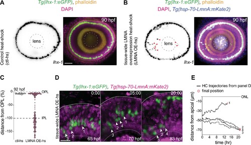 (A–B) Immunofluorescence images of (A) control heat-shocked (control-hs), and (B) LMNA overexpressing heat-shocked (LMNA OE-hs) at 90 hours post fertilization (hpf). Tg(lhx-1:eGFP) embryos were used for ctl-hs, and Tg(lhx-1:eGFP) × Tg(hsp70:LMNA-mKate2) double-transgene retinae for LMNA OE-hs experiments. Tg(lhx-1:eGFP) marks horizontal cells (HCs) (green), Tg(hsp70:LMNA-mKate2) is expressed in nuclear envelopes upon heat-shock (blue), DAPI labels nuclei (magenta), and phalloidin marks actin (yellow). Red arrowheads: ectopically positioned HCs, dashed circle: lens. Scale bar: 50 μm. (C) Position of HCs relative to outer plexiform layer (OPL) in control heat-shocked (ctl-hs) (n=27, N=5), and LMNA OE-hs (n=283, N=11) at 92 hpf. See Figure 5—source data 1. (D) Stills from a 20 hr time-lapse of Tg(lhx-1:eGFP) × Tg(hsp70:LMNA-mKate2) double-transgene retinae after heat-shock (LMNA OE-hs). Arrowheads: tracked HCs. Scale bar: 20 μm. (E) Migration trajectory of tracked HCs from (D). HC-2, HC-3, and HC-4 remained ectopically positioned in the basal part of the retina, while HC-1 successfully reached the HC layer. See Figure 5—source data 1. See also Figure 5—figure supplement 1.