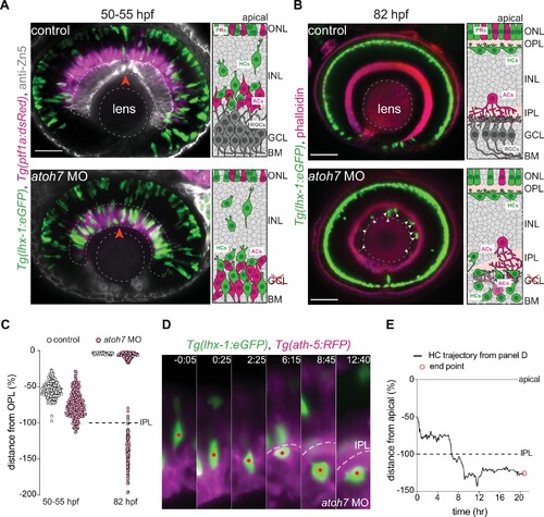 The inner plexiform layer (IPL) poses a barrier for horizontal cell apical migration. (A–B) Immunofluorescence images of control (top) and atoh7 morpholino (atoh7 MO) [bottom] at 50–55 hours post fertilization (hpf) (A), and at 82 hpf (B). Schemes of each condition are seen on the right. Tg(lhx-1:eGFP) is expressed in horizontal cells (HCs) (green), Tg(ptf1a1:dsRed) is expressed in amacrine cells (ACs) and HCs (magenta), anti-Zn5 marks retinal ganglion cells (RGCs) (gray), and phalloidin marks actin (magenta). In atoh7 MO retinae, the most basal layer is devoid of RGCs (gray in control) and is instead filled with ACs (magenta), and HCs (green). (A) HCs reach ectopic basal positions adjacent to the basement membrane (BM) in atoh7 MO retinae. Red arrowheads: BM. (B) Many HCs remain trapped beneath the IPL in atoh7 MO retinae. White arrowheads: trapped HCs; dashed circle: lens. Scale bar: 50 μm. (C) Position of HCs relative to the outer plexiform layer (OPL) in control (n=196, N=12) and atoh7 MO (n=261, N=14) retinae at 50–55 hpf, and control (n=76, N=11) and atoh7 MO (n=312, N=15) at 82 hpf. At 50–55 hpf, the depth of HC migration increases in atoh7 MO compared to controls. At 82 hpf, many HCs are ectopically located below the IPL in atoh7 MO, while in controls all HCs reached their layer. See Figure 6—source data 1. (D) Time series of an HC (red dot) in atoh7 MO retinae. Dashed line: the IPL. Scale bar: 20 μm. Time in h:min. (E) Migration trajectory of the tracked HC from (D). See Figure 6—source data 1.See also Figure 6—figure supplement 1. |