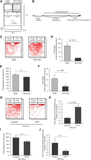 Effect of NYT on aggressive behavior in NPY-KO zebrafish. Wild and NPY-KO zebrafish were fed either control or NYT twice a day for 4 days. Two unfamiliar male zebrafish were set in an aquarium, and their aggressive behavior was analyzed. (A) Test apparatus. (B) Experimental scheme for behavioral evaluation. (C) Tracking of wild (left) and NPY-KO zebrafish (right) swimming behavior. (D) Total number of chases in the WT and NPY-KO zebrafish. (E) Total number of circles in the WT and NPY-KO zebrafish. Wild, n = 6; NPY-KO, n = 7. (F) Total time of aggression in wild and NPY-KO zebrafish. (G) Tracking of control (left) and NYT-fed (right) swimming behavior in NPY-KO zebrafish. (H) Total number of chases in control and NYT-fed NPY-KO zebrafish. (I) Total number of circles in control and NYT-fed NPY-KO zebrafish. (J) Total aggression time in control and NYT-fed NPY-KO zebrafish. n = 6. n.s., not significant. Results are shown as mean ± standard error of the mean. |