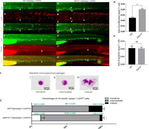 (A–C’, E–G’) pH3 and transferase dUTP nick end labeling (TUNEL) assays in zbtb14-/-//Tg(mpeg1.1:eGFP) and Tg(mpeg1:EGFP) control larvae. Triangles indicate positive signals. (D, H) Statistical result for A–C’ and E–G’. Data shown are the means ± standard error of the mean (SEM) of at least 15 larvae. ns: not statistically significant, **p<0.01. (I) Classification of zebrafish monocytes/macrophages is based on their morphology. (J) Quantification of mpeg1.1 + cells at each differentiation stage. Sorted macrophage lineage cells from 10-month-old zbtb14-/-//Tg(mpeg1.1:eGFP) and Tg(mpeg1.1:eGFP) larvae were subjected to May-Grünwald-Giemsa staining and separated into immature, intermediate, and mature groups according to their morphology. Scale bar: 10 µm. Error bars represent mean ± SEM of three independent experiments. *p<0.05 (Student’s t-test).