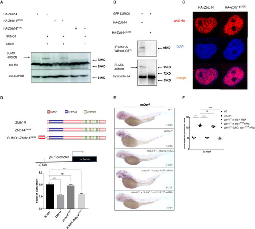 (A) Western blot analysis (anti-HA) of HA-tagged wild type (WT), Zbtb14K40R, and Zbtb14K259R mutant proteins expressed in HEK293T cells in the absence or presence with the SUMO (Small Ubiquitin-like MOdifier) conjugating enzyme UBC9 and SUMO1. (B) HA-tagged WT or Zbtb14K40R mutant protein was immunoprecipitated with an anti-HA antibody from HEK293T cells co-expressing GFP-SUMO1, and SUMOylated Zbtb14 protein was detected by western blot with an anti-GFP antibody. (C) Immunofluorescence analysis of WT (left panel) and Zbtb14K40R mutant protein (right panel). (D) The structure of variant forms of Zbtb14, including WT, Zbtb14K40R, and SUMO1-Zbtb14K40R mutants (top panel). Repression of luciferase expression from the zebrafish pu.1 promoter (–0.6 kb) by Zbtb14 mutants (bottom panel). Bars showed the relative luciferase activity on the zebrafish pu.1 promoter (–0.6 kb). (Student’s t test, N=3. Error bars represent mean ± standard error of the mean (SEM). ns: not statistically significant, ***p<0.001.) (E) mRNA rescue assays in zbtb14-/- mutant larvae. mfap4 probe was used in whole-mount in situ hybridization (WISH) to examine rescue effects of injections of zbtb14, zbtb14K40R, and SUMO1-zbtb14K40R mRNA. (F) Statistical result for E. The statistical significance was calculated by using one-way analysis of variance (ANOVA). The asterisk indicates a statistical difference. (N=3, 10–17 embryos were used for each experiment. Each dot represents the mean value of one experiment. Error bars represent mean ± SEM. ns: not statistically significant, ****p<0.0001.)