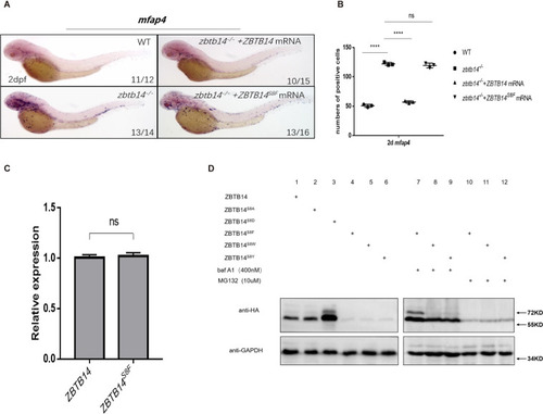 (A) mRNA rescue assays in zbtb14-/- mutant larvae. mfap4 probe was used in whole-mount in situ hybridization (WISH) to examine rescue effects of injections of ZBTB14 and ZBTB14S8F mRNA. (B) Statistical result for A. The statistical significance was calculated by using one-way analysis of variance (ANOVA). The asterisk indicates a statistical difference. (N=3, 10–16 embryos were used for each experiment. Each dot represents the mean value of one experiment. Error bars represent mean ± standard error of the mean (SEM). ns: not statistically significant, ****p<0.0001.) (C) Quantitative reverse transcriptase polymerase chain reaction analysis of ZBTB14 and ZBTB14S8F transfected in HEK293T cells. To determine the relative expression rate, data were normalized to the expression level of wild type (WT) groups (which were set to 1.0) after normalized to the internal control of β-actin. (Student’s t test, N=3. Error bars represent mean ± SEM. ns: not statistically significant.) (D) Western blot analysis (anti-HA) of HA-tagged WT, ZBTB14S8A, ZBTB14S8D, ZBTB14S8F, ZBTB14S8W, and ZBTB14S8Y mutant proteins expressed in HEK293T cells in the absence or presence with baf A1 or MG132. GAPDH served as internal control.