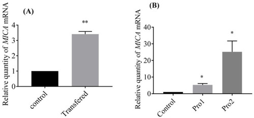 MICA was induced by GmIFN–γ. (A) pcDNA3.1-GmIFN–γ was transferred into EPC cells, and the endogenous GmIFN–γ induced the MICA expression; ** indicates p < 0.01. (B) EPC cells were incubated with 100 μg/mL GmIFN–γ for 24 h. Pro1 was from E. coli BL21, while Pro2 was from P. pastoris GS115; * indicates p < 0.05. |