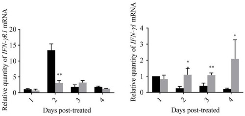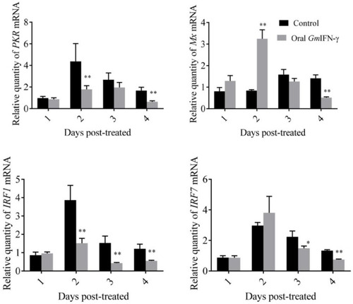Expression levels of genes related to the IFN–I signal pathway of zebrafish fed with yeast containing GmIFN–γ. T tests were used for statistical analysis. * indicates significant differences ( |
