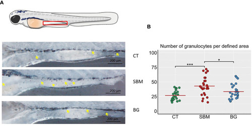 Localization of granulocytes in the intestine of zebrafish larvae. |