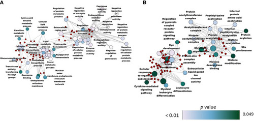 Network plot showing the link between the enriched GO terms. DEGs (downregulated; SBM vs CT) that were considered for the enrichment are indicated using red circles and only the non-redundant GO terms are shown in the cluster. The gradient color bar intensity varies with the |