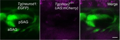 Lineage labeling in developing statoacoustic ganglion at 48 hpf using shox2 fluorescent reporters. Fluorescent images of developing inner ear from larvae containing Tg(shox2Gal4,UAS:mCherry) (magenta) and Tg(neurod1: EGFP) (green) neuronal reporter at 48 hpf. Merged image shows no shox2 reporter labeled cells in either anterior or posterior statoacoustic ganglion neurons (n= 5). EXPRESSION / LABELING:
