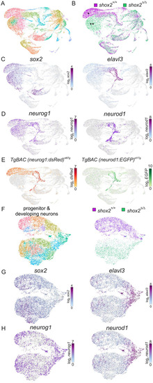 Identifying cell populations in shox2+/+ and shox2Δ/Δ embryos by single cell RNA-seq. (A) shox2+/+ (n=59 embryos) and shox2Δ/Δ embryos (n=43 embryos) at 16-22 hpf were harvested and tissue around the otic vesicle microdissected. Samples of the same genotype were pooled and subjected to scRNA-seq. Transcriptome of individual cells were aggregated, dimensionality reduction performed followed by unsupervised clustering before visualizing as a UMAP projection. Course-grain visualization of 29,152 cells identified 28 distinct cell types after clustering. (B) Cells from shox2+/+ (magenta) and shox2Δ/Δ (green) were identified using by library barcodes to display different and common cell populations. Major differences between wild-type and mutant cell populations were marked by single or double asterisks respectively. (C) sox2 highlight progenitor cells while elavl3 mark developing neurons. (D) neurog1 and neruod1 identify neuronal progenitors and developing neurons. (E) Cells expressing dsRed and EGFP from transgenes introduced into shox2+/+ embryos. Cell clusters identified from graph-based clustering that overlapped with dsRed and EGFP in shox2+/+ and shox2Δ/Δ were used to identify progenitors and developing neurons. (F) Plot of progenitor and development obtained from identified subset of cell clusters were obtained for further analysis. Progenitor and developing neuron populations from shox2+/+ (magenta) and shox2Δ/Δ (green) cells were identified using library identification barcodes for each genotype. (G) Sub-population of cells express sox2 and elavl3 to mark progenitor and developing neurons, respectively. (H) Sub- population of cells express neurog1 and neruod1 to mark neuronal progenitors and developing neurons, respectively. |