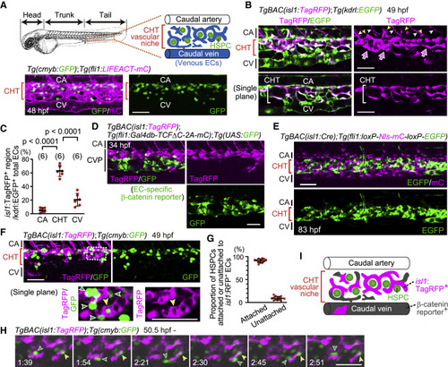 Figure 1. isl1 lineage ECs mostly contribute to the vascular HSPC niche in the CHT (A) Representative confocal images of the tail of a Tg(cmyb:GFP);Tg(fli1:LIFEACT-mCherry) embryo (48 hpf). cmyb:GFP+ HSPCs are located in the CHT. Images displayed in all the figures are 3D-rendered confocal images of a stack unless otherwise noted. Lateral views, anterior to the left. Confocal images in all the figures are representative of at least three independent experiments. (B) Tail of a TgBAC(isl1:TagRFP);Tg(kdrl:EGFP) embryo (49 hpf). Upper, projection view; lower, single plane of the upper panel. In the caudal vasculature marked by EGFP expression, isl1:TagRFP expression is mainly found in venous ECs in the CHT (arrows). isl1:TagRFP+ cells around the CA are not arterial ECs but CHT-derived venous intersegmental vessels (vISVs) (yellow arrowheads) and motor neurons (white arrowheads). (C) Quantitative analysis of the data shown in (B). Graph shows the percentage of the volume of isl1:TagRFP+ voxels among the whole EC volume (kdrl:EGFP+ voxels) in the CA, CHT, and CV at 49–50 hpf. Each ROI was set as explained in Figure S1I. Data are mean ± SD. Each dot represents an individual embryo in this and the following graphs unless otherwise described. The number of embryos analyzed is indicated at the top. (D) Tail of a TgBAC(isl1:TagRFP);Tg(fli1:Gal4db-TCFΔC-2A-mCherry);Tg(UAS:GFP) embryo (34 hpf). Of note, GFP+ cells rarely express isl1:TagRFP and vice versa. (E) Tail of a TgBAC(isl1:Cre);Tg(fli1:loxP-Nls-mCherry-loxP-EGFP) embryo (83 hpf). Cre-driven EGFP expression in ECs is mainly detected in the CHT. (F) Tail of a TgBAC(isl1:TagRFP);Tg(cmyb:GFP) embryo (49 hpf). Upper, projection view; lower, single plane of the boxed area. Most cmyb:GFP+ HSPCs (green arrowheads) are found adjacent to isl1:RFP+ ECs in the CHT; yellow arrowheads point to a single cmyb:GFP+ HSPC surrounded by isl1:RFP+ ECs. (G) Graph shows the percentage of cmyb:GFP+ HSPCs attached or unattached to isl1:RFP+ ECs among all the cmyb:GFP+ HSPCs in the CHT. Data are mean ± SD (n = 13). (H) Time-sequential images of a TgBAC(isl1:TagRFP);Tg(cmyb:GFP) embryo (from 50.5 hpf). Elapsed time (h:min). In the CHT, cmyb:GFP+ HSPCs stay adjacent to isl1:RFP+ ECs (yellow arrowheads) or migrate toward other isl1:RFP+ ECs (green arrowheads). (I) Schematic representation of the CHT and caudal vessels. Scale bars, 50 μm. CHT, caudal hematopoietic tissue; HSPC, hematopoietic stem and progenitor cell; CA, caudal artery; CV, caudal vein; CVP, caudal vein plexus. See also Figure S1 and Video S1. |