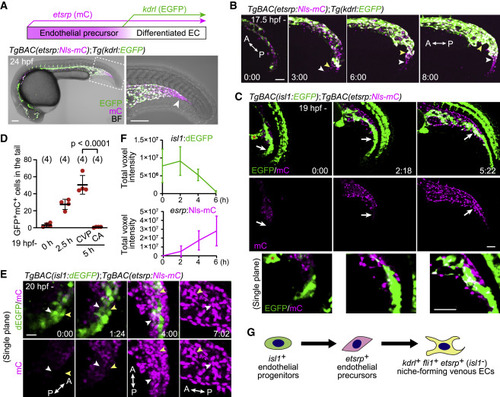 Figure 2. Identification of isl1+ endothelial progenitors as a source of ECs in the CHT (A) Visualization of etsrp:mCherry+ endothelial precursors (magenta) and their differentiation into kdrl:EGFP+ ECs (green, upper). TgBAC(etsrp:Nls-mCherry);Tg(kdrl:EGFP) embryo at 24 hpf (lower). The boxed area is enlarged on the right. mCherry single-positive endothelial precursors are observed in the most posterior region of the tail (arrowhead). (B) Time-sequential images of a TgBAC(etsrp:Nls-mCherry);Tg(kdrl:EGFP) embryo (from 17.5 hpf). Elapsed time (h:min). etsrp:mCherry+ endothelial precursors in the most posterior region of the tail differentiate into kdrl:EGFP+ ECs (arrowheads point to individual cells). (C) Time-sequential images of a TgBAC(isl1:EGFP);TgBAC(etsrp:Nls-mCherry) embryo (from 19 hpf). Elapsed time (h:min). Top and middle, projection view images; bottom, enlarged single confocal plane images of the regions pointed to by arrows. isl1:EGFP+ cells on the ventral side of the tail that do not initially express etsrp:mCherry differentiate into etsrp:mCherry+ endothelial precursors (arrows). isl1:EGFP is also detected in the presumptive cloaca (red asterisk) and neural tube. (D) Quantitative analysis of the data shown in (C). The number of isl1:GFP/etsrp:Nls-mCherry double-positive cells in the ventral region of the tail was counted at the indicated time (from 19 hpf). The double-positive cells were separately counted in the CA and the CVP only at 5 h because the CA and the CVP are indistinguishable until then (i.e., 24 hpf). Data are mean ± SD. (E) Time-sequential images of a TgBAC(isl1:dEGFP);TgBAC(etsrp:Nls-mCherry) embryo (from 20 hpf). Single confocal planes that contain the two tracked cells (white and yellow arrowheads) are shown. (F) Quantitative analysis of the data shown in (E). Time trace of the total voxel intensity of isl1:dEGFP or etsrp:Nls-mCherry in the ventral region of the tail. Data are mean ± SD (n = 3). (G) Schematic of differentiation of isl1+ endothelial progenitors. isl1+ endothelial progenitors exclusively differentiate into caudal venous ECs via etsrp+ endothelial precursors. Scale bars, 50 μm. BF, bright field; A, anterior; P, posterior. See also Figure S2 and Videos S2, S3, and S4. |