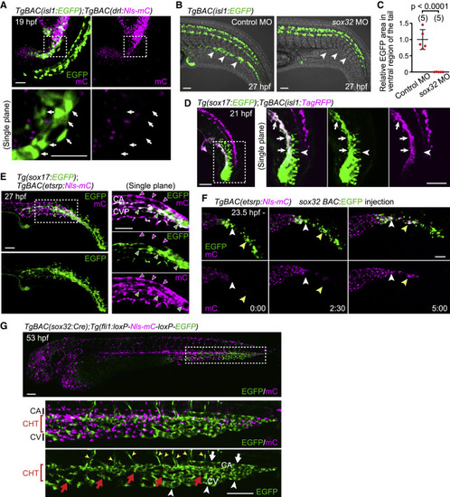Figure 4. The isl1+ endothelial progenitors do not originate from the lateral plate mesoderm but from cells expressing sox32 and sox17 (A) TgBAC(isl1:EGFP);TgBAC(drl:Nls-mCherry) embryo (19 hpf). Upper, projection view; lower, single confocal plane of the boxed area. isl1:EGFP+ cells (arrows) do not express drl:mCherry. (B) TgBAC(isl1:EGFP) embryos (27 hpf) injected with control MO or sox32 MO. Ventral isl1:EGFP+ cells are not detected in sox32 morphants (arrowheads). (C) Quantitative analyses of the data shown in (B). EGFP area in the ventral region of the tail in embryos injected with sox32 MO relative to that in embryos injected with control MO as shown in Figure S5B. Data are mean ± SD. (D) Tg(sox17:EGFP);TgBAC(isl1:TagRFP) embryo (21 hpf). Left, projection view; right, single confocal plane of the boxed area. Arrows point to sox17:EGFP/isl1:TagRFP double-positive cells. Arrowheads point to sox17:EGFP single-positive notochord cells. (E) Tg(sox17:EGFP);TgBAC(etsrp:Nls-mCherry) embryo (27 hpf). Left, projection view; right, single plane of the boxed area. sox17:EGFP expression in the CVP (green arrowheads) but not in the CA (magenta arrowheads). (F) Time-sequential images in the tail of TgBAC(etsrp:Nls-mCherry) (from 23.5 hpf) injected with sox32 BAC:EGFP plasmid that drives EGFP expression under the control of a sox32 BAC promoter in a mosaic manner. sox32:EGFP+ cells differentiate into etsrp:mCherry+ endothelial precursors (arrowheads point to individual cells). (G) TgBAC(sox32:Cre);Tg(fli1:loxP-Nls-mCherry-loxP-EGFP) embryo (53 hpf). The boxed area is enlarged (middle and bottom). Cre-driven EGFP expression in ECs is restricted to the tail, especially in the CHT (red arrows) and CHT-derived vISVs (yellow arrowheads). In the most posterior end, it is found in almost all ECs including the CA (white arrowhead), CHT (red arrows), and CV (white arrows). Scale bars: 50 μm in (A), (B), and (D)–(F) and 100 μm in (G). See also Figure S4. |