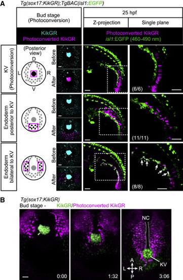 Figure 5. The isl1+ endothelial progenitors derive from endodermal cells (A) Tg(sox17:KikGR);TgBAC(isl1:EGFP) embryos at bud stage (10 hpf) photoconverted in the KV (upper) or in endodermal cells posterior to the KV (middle) or lateral to the KV (lower) as indicated on the left. Left, posterior views at bud stage; middle and right, lateral views at 25 hpf. Arrows point to photoconverted cells expressing isl1:EGFP. EGFP fluorescence can be separated by 460–490 nm range of emission filter as in Figures S4J and S4K. Left and middle, projection views; right, single confocal planes. The number of embryos analyzed in each case is indicated in the right panels. (B) Time-sequential confocal images of a Tg(sox17:KikGR) embryo (from the bud stage) just after KikGR was photoconverted in endodermal cells located lateral to the KV. Posterior view. Scale bars, 50 μm. KV, Kupffer’s vesicle; D, dorsal; V, ventral; L, left; R, right. See also Figure S4 and Videos S5 and S6. |