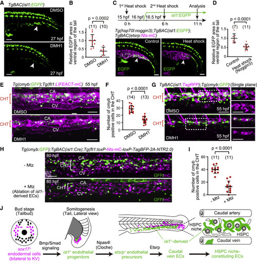 Figure 6. isl1+ endothelial progenitors are specified by Bmp-Smad signaling and constitute the vascular HSPC niche (A) TgBAC(isl1:EGFP) embryos treated with DMSO or DMH1 at 15 hpf (i.e., in advance of isl1:EGFP expression [16–16.5 hpf]) and observed 12 h after the treatment. The number of isl1:EGFP+ cells in the tail is markedly decreased by DMH1 treatment (arrowheads). (B) Quantitative analysis of the data shown in (A). isl1:EGFP area in the ventral region of the tail in embryos treated with DMH1 relative to that in embryos treated with DMSO. EGFP area is measured as in Figure S5B. Data are mean ± SD. (C) Tg(hsp70l:noggin3);TgBAC(isl1:EGFP);TgBAC(etsrp:Nls-mCherry) embryos without (control) or subjected to heat shock twice (upper, schematic illustration). The number of isl1:EGFP+ cells in the tail is markedly decreased by Noggin3 overexpression (arrowheads). (D) Quantitative analysis of the data shown in (C). isl1:EGFP area as in (B) in the heat-shocked embryos relative to that in embryos without heat shock. Data are mean ± SD. (E) Tail of Tg(cmyb:GFP);Tg(fli1:LIFEACT-mCherry) embryos (55 hpf) treated with DMSO or DMH1 for 12 h starting at 15 hpf. (F) Number of cmyb:GFP+ cells in the CHT regions of DMSO- or DMH1-treated embryos (54–55 hpf), as observed in (E). Data are mean ± SD. (G) Tail of TgBAC(isl1:TagRFP);Tg(cmyb:GFP) embryos (55 hpf) treated with DMSO or DMH1 for 12 h starting at 15 hpf as in (E). Left, projection view; right, single planes of the boxed areas. (H) Tail of TgBAC(isl1:Cre);Tg(fli1:loxP-Nls-mCherry-loxP-TagBFP-2A-NTR2.0) larvae (80 hpf) treated with or without Mtz for 24 h starting at 35 hpf. (I) Number of cmyb:GFP+ cells in the CHT regions of larvae (80–81 hpf) treated with or without Mtz, as observed in (H). Data are mean ± SD. (J) Schematic representation of the development of caudal vein ECs from sox17+ endodermal cells. Scale bars, 50 μm. See also Figure S5. |