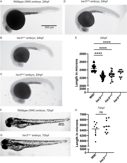 Fig. 5. her3 null mutant lines are significantly smaller than wildtype WIK at 24hpf. (A–D) Brightfield images of 24hpf wildtype WIK (A), 24hpf her3nch1 (B), 24hpf her3nch2 (C), and 24hpf her3nch3 (D) embryos. Images were taken on a Leica M205FA fluorescent stereoscope. Scale bar is 500 μm. (E) The standard length of each embryo was measured and graphed here. WIK: n = 28. her3nch1: n = 25. her3nch2: n = 25. her3nch3: n = 13. For each comparison to WIK, p < 1.00 × 10−4 using a one-way ANOVA with Dunnett test. (F–G) Brightfield images of 72hpf wildtype WIK (F) and 72hpf her3nch1 (G) embryos. (H) The standard length of each 72hpf embryo was also measured and graphed here. n = 10 for both WIK and her3nch1. Each point is an individual fish. An unpaired Welch's t-test indicated this comparison was not statistically significant. PHENOTYPE: